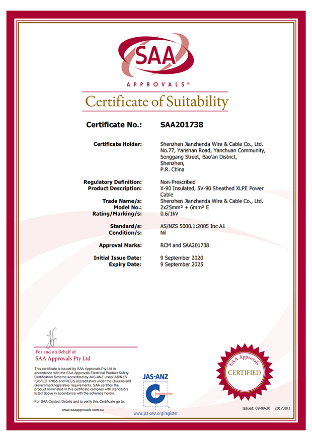 深圳建圳達電線電纜有限公司,成立于2000年,是一家電線電纜制造商,我們通過了世界各地不同市場的多數認證,如:CCC、RoHS、CB、SAA、TUV、VDE、PSE、BPS、UL、CSA。我們根據定制產品不斷更新新的認證。經過數十年的發(fā)展,我們與來自世界各地的客戶建立了長期的合作關系。我們曾經是菲律賓機場,,柬埔寨的電力站,美國的醫(yī)院,工廠,埃塞俄比亞的水電站項目。我們是一家值得信賴的電線供應商。